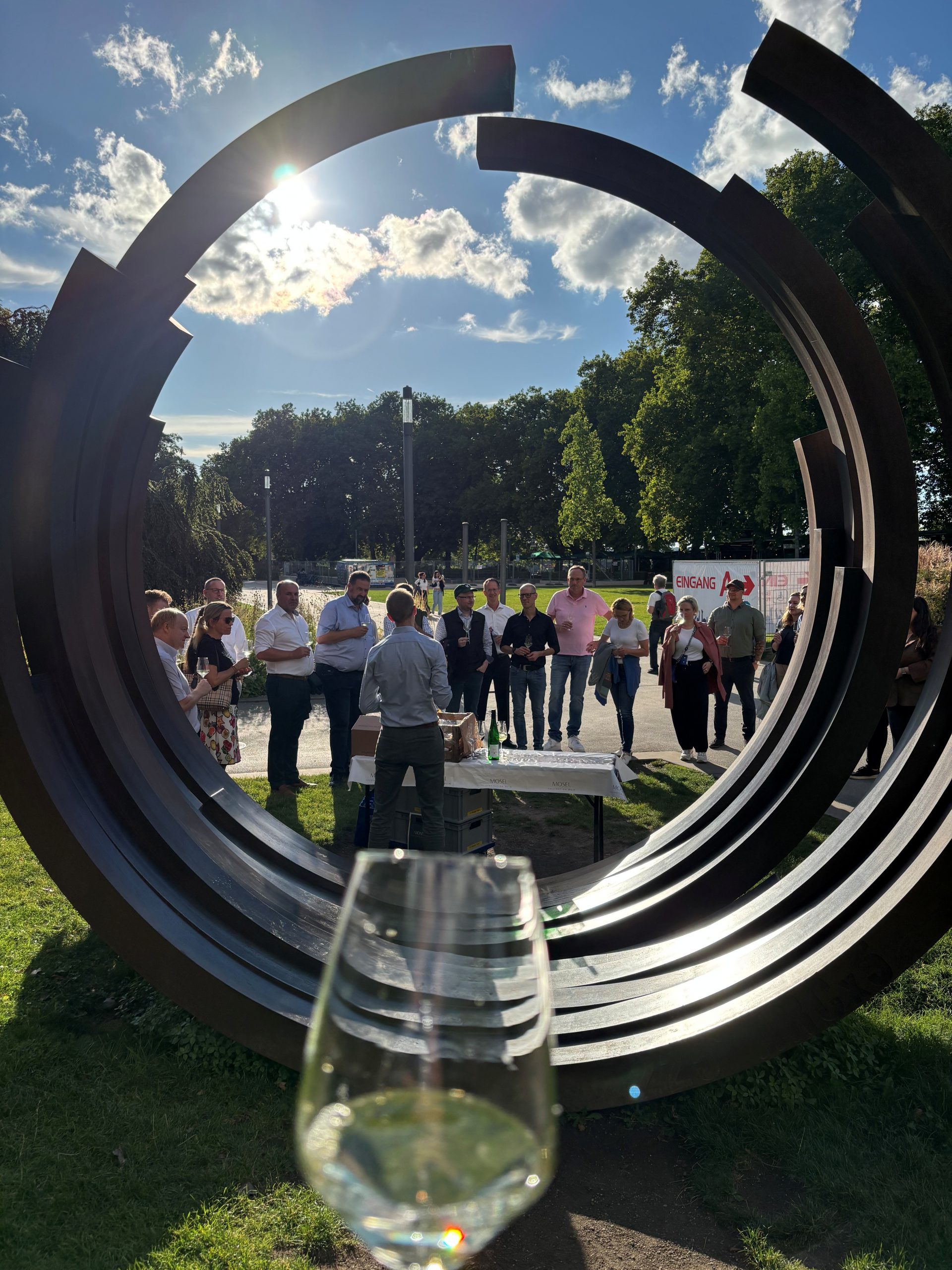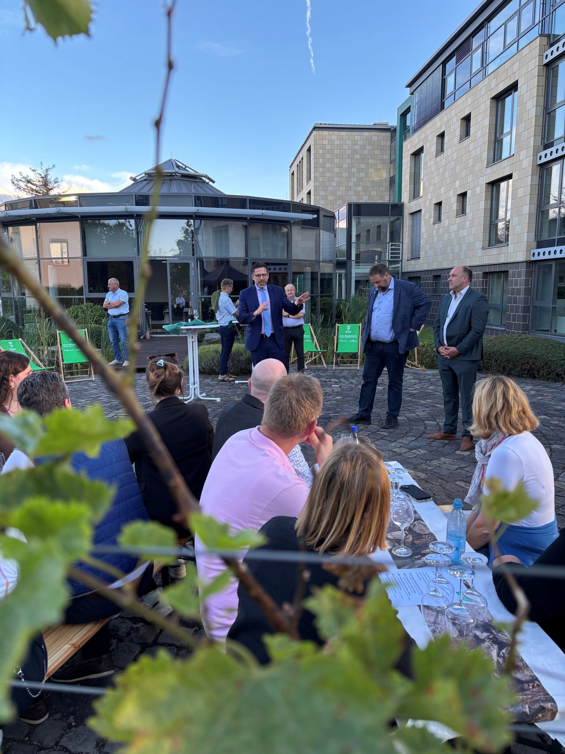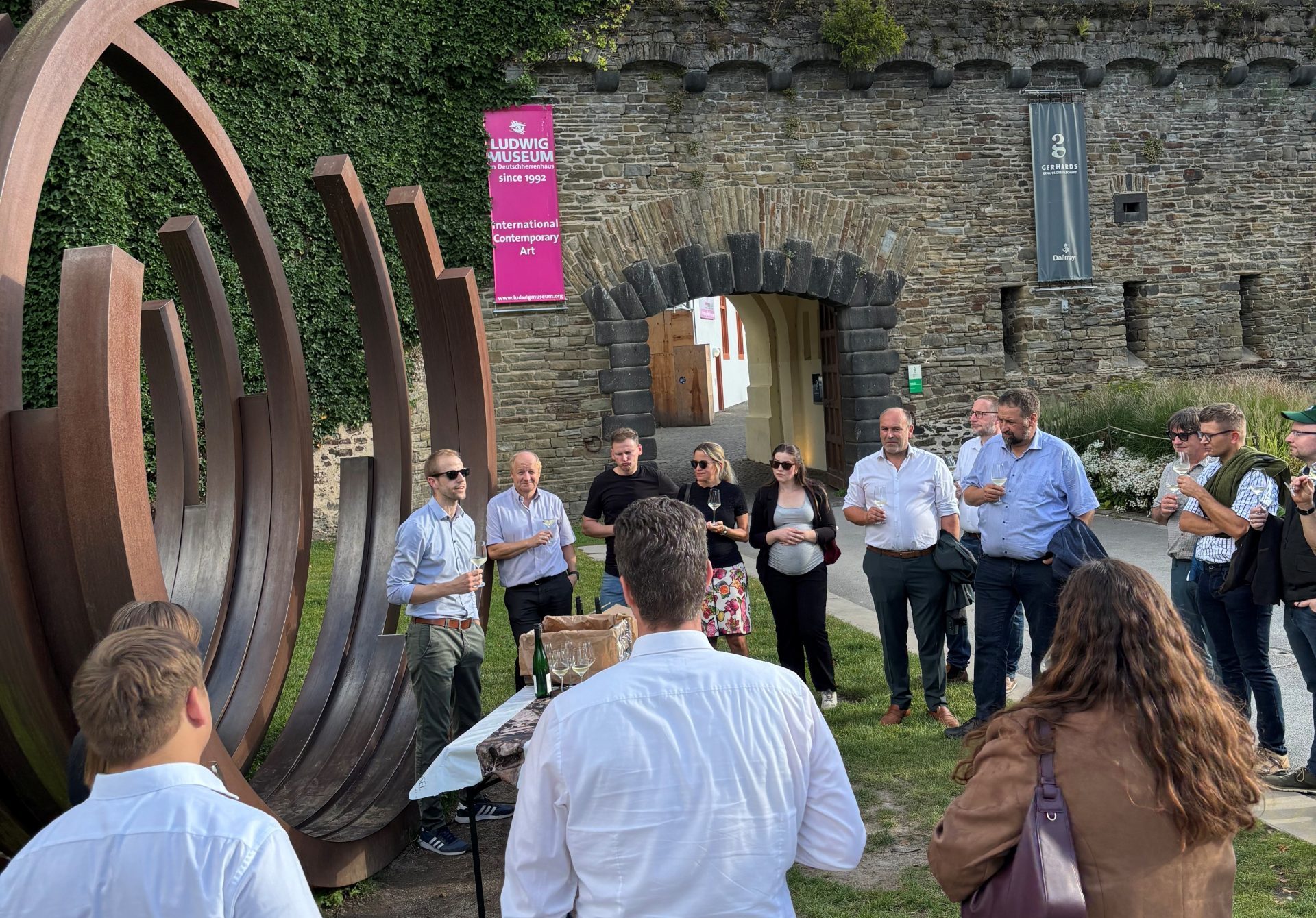 Ein Besuch in Koblenz durfte natürlich nicht ohne eine kurze Stadtführung mit einer Überraschung am Deutschen Eck enden: Am Eingang zum Museum Ludwig erwartete die Besucher aus ganz Deutschland eine kleine Weinprobe mit Riesling aus den Weinanbaugebieten „Mosel“ und „Mittelrhein“, die vor Ort als Flüsse zusammenfließen. BWV-Weinbaureferent Dr. Maximilian Hendgen entführte die Zuhörer in die Steil- und Steilstlagen von Mosel und Mittelrhein, hob die Besonderheiten der einzelnen Lagen hervor und unterstrich die lange Geschichte des Weinbaus. So zählten Rieslinge von der Mosel über Jahrzehnte zu den teuersten Weinen der Welt. Auch heute noch werde in mühevoller Manufakturarbeit die Weinlese vollzogen und so schimmerte im Glas der Gäste das Gold der Reben.