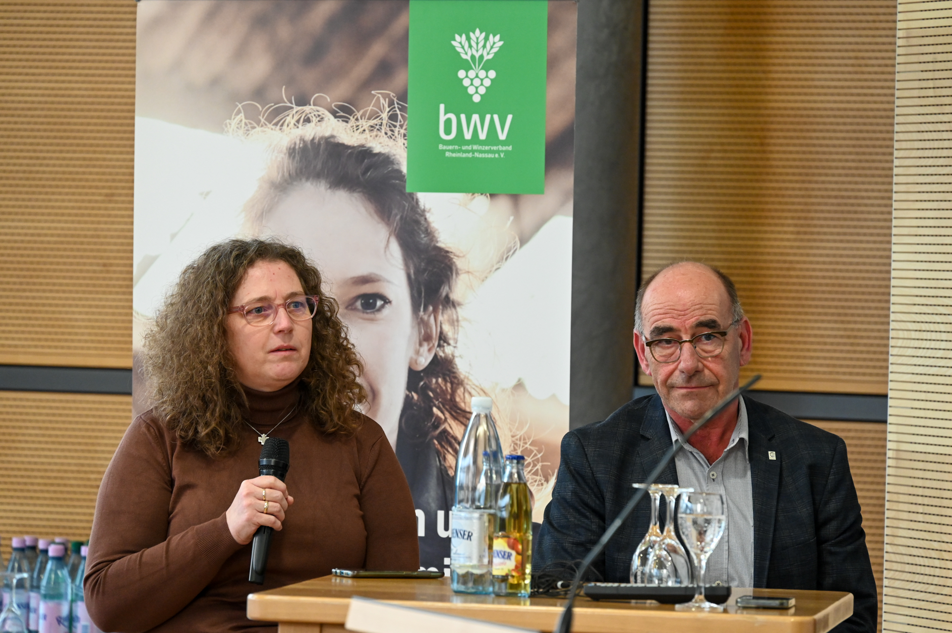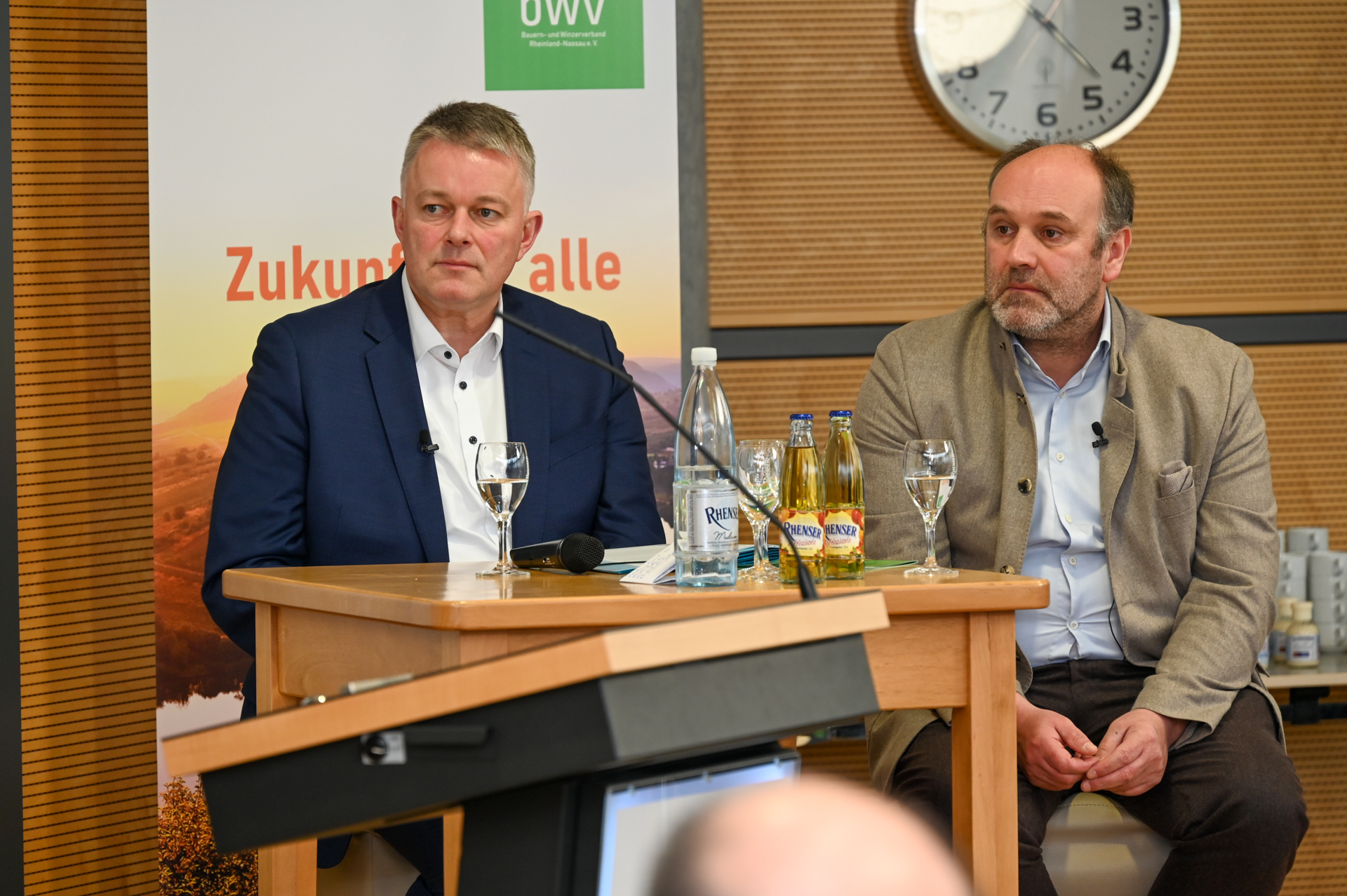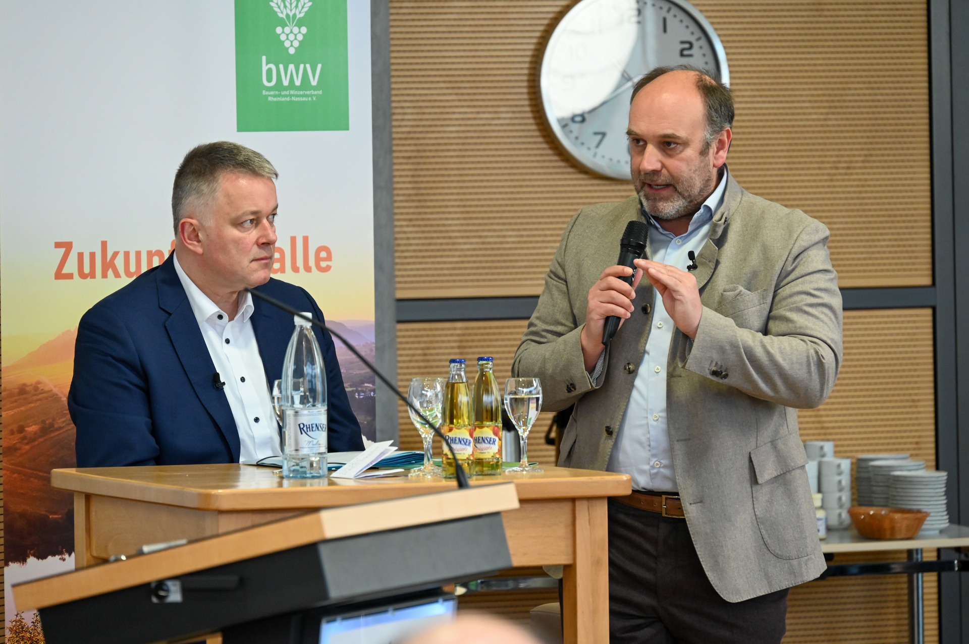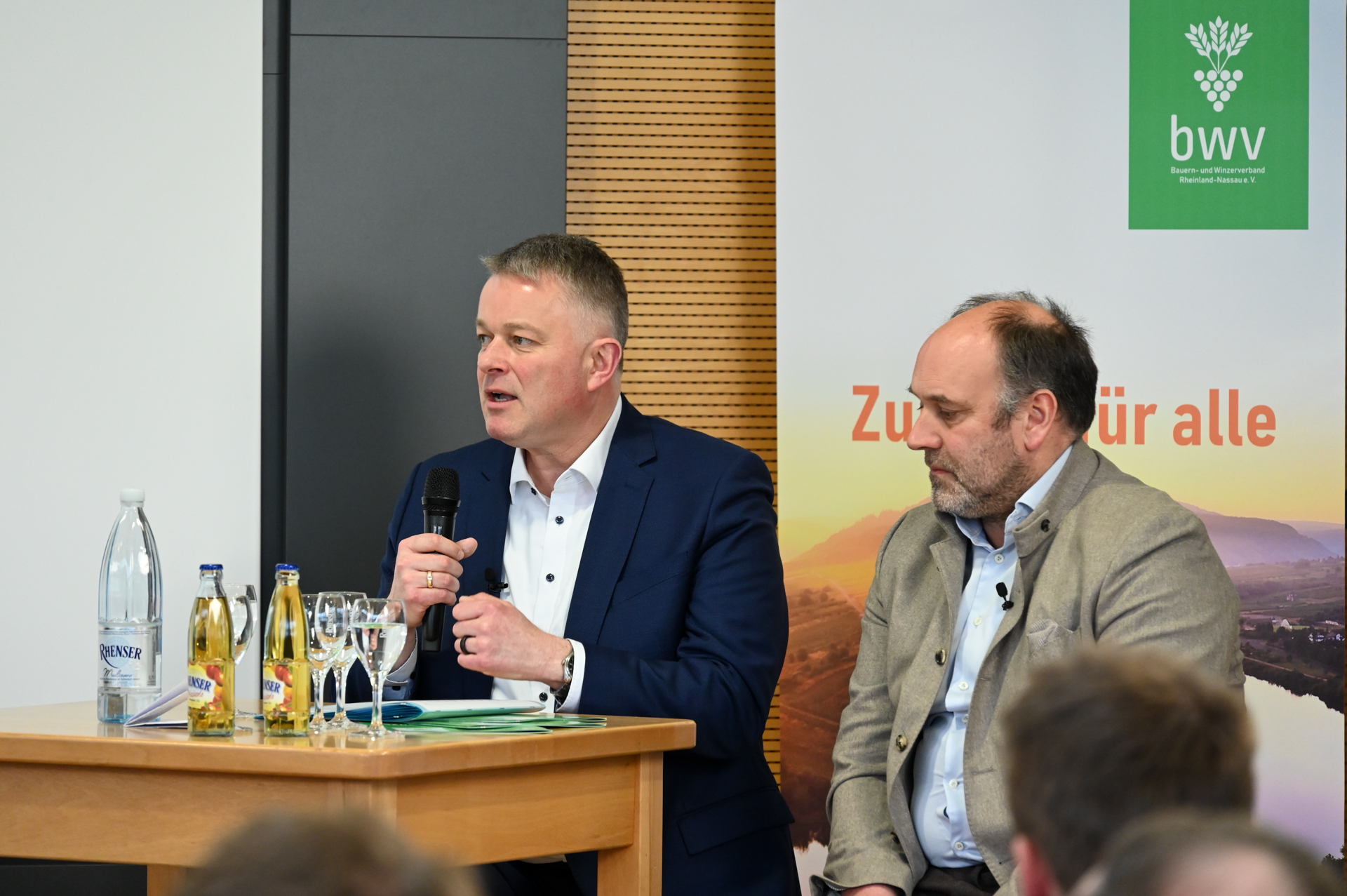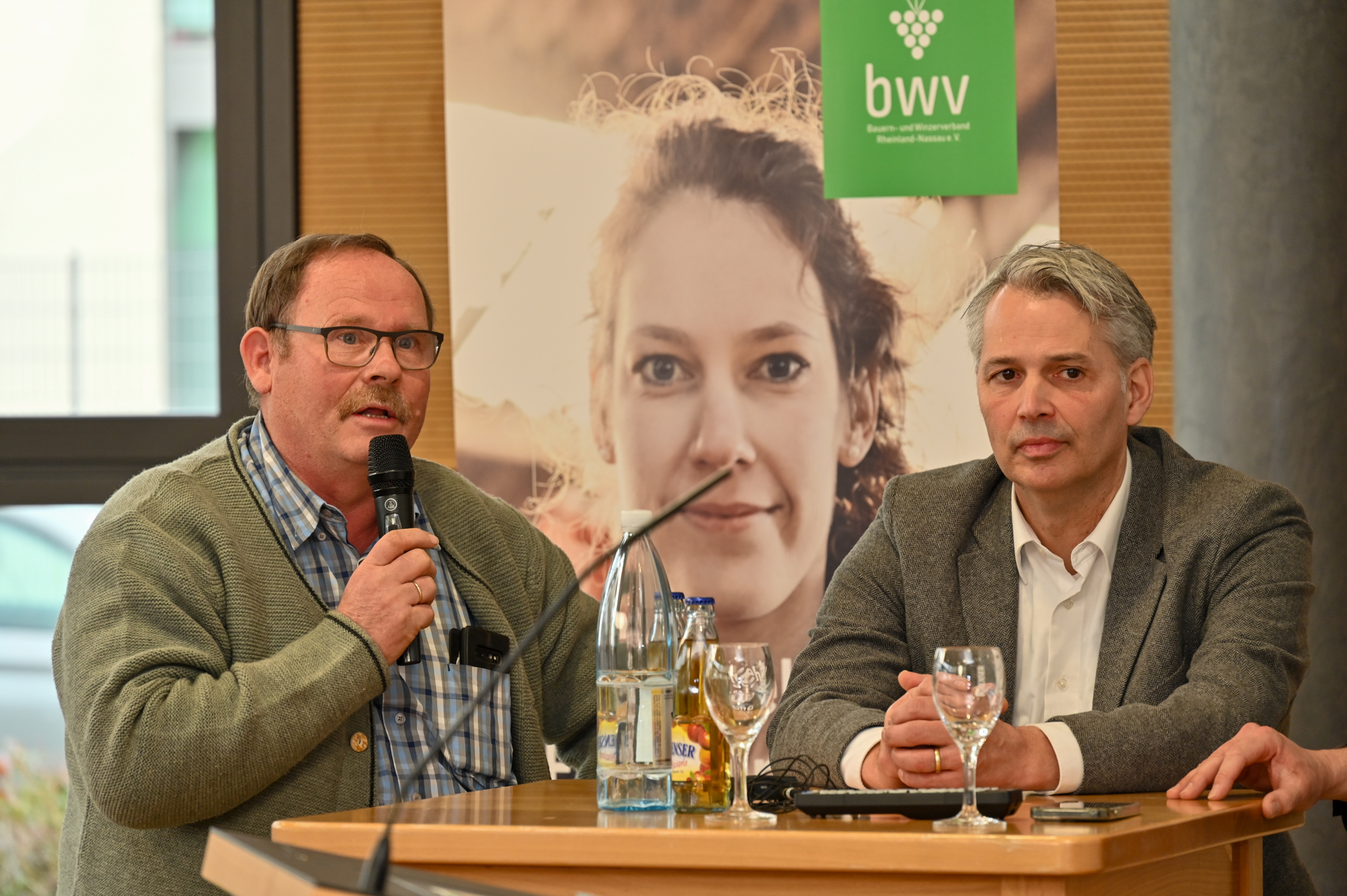 Weinbaupräsident Walter Clüsserath wies darauf hin, dass die Leiterin der EU-Generaldirektion Elisabeth Werner festgestellt habe, dass nur 12 Prozent aller Bauern in der EU unter 40 Jahre alt seien und damit langfristig die Ernährungssicherheit in der EU nicht mehr gewährleistet sei. Diese begegneten zudem immer wieder neuen Anforderungen. So stehe die Natur-Wiederherstellungs-Verordnung in den Startlöchern, mit all ihren Regelungen und Auflagen. Damit würden die potenziellen Hofnachfolger weiter abgeschreckt. Weiterhin kritisierte Clüsserath die aktuelle Umsatzsteuerregelung, die dringend geändert werden müsse, um die Steuerlast der Betriebe zu reduzieren. Er forderte die Rücknahme dieser in zwei Schritten erfolgten Vorsteuerpauschalierung der ehemaligen Bundesregierung. Außerdem plädierte er für die Sozialversicherungsfreiheit für landwirtschaftliche Saisonarbeitskräfte bei einer Tätigkeit im Jahr. Das Verbandsklagerecht müsse eingeschränkt werden. Die Deutsche Umwelthilfe nannte Clüsserath als prominentes Negativbeispiel. Clüsserath begrüßte die Reduzierung der bürokratischen statistischen Auflagen des Landes durch Ministerin Daniela Schmitt. Der Bund müsse die Vorerntestatistik ebenfalls abschaffen, forderte er. Künftig müsse eine zweckgebundene Tourismusabgabe in Höhe von zwei Euro pro Übernachtung und Gast eingeführt werden, um die Steillagen-Weinwirtschaft in Höhe von ca. 5.000 Euro pro Hektar unterstützen zu können. Ansonsten wären die Kosten kaum mehr einzufangen. Schnieder betonte, dass er sich für sozialversicherungsfreie Beschäftigungsverhältnisse für Saisonarbeitskräfte einsetze. Die gewünschten sozialversicherungsfreien 140 Arbeitstage im Jahr für Saisonarbeitskräfte hätten politisch bisher bedauerlicherweise nicht erzielt werden können, die aktuell geltenden 90 Tagen seien lediglich ein Kompromiss. Schnieder widersprach der Einführung weiterer Abgaben. Die Steillagenförderung sei hingegen zu unterstützen, die aber auf anderem Wege finanziert werden müsse. Auch über eine Rückführung des Verbandsklagerechts müsse angesichts des aktuell inflationären Gebrauchs nachgedacht werden.